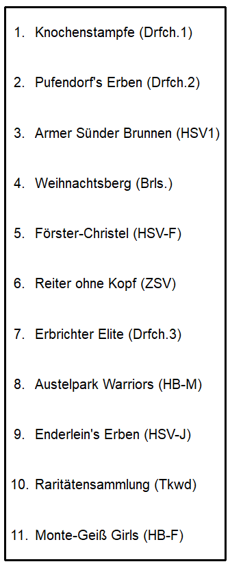In insgesamt 40 Partien wurden die Platzierungen des Tages ausgespielt. Ein Marathon, aber mit der guten Mitarbeit aller Mannschaften und ohne Zwischenfälle konnte man den engen Zeitplan einhalten. Die rote Laterne des Turniers ging an die ersatzgeschwächten Monte-Geiß Girls der Handball-Damen. Im Spiel um Platz 9 konnten sich Enderlein´s Erben (Volleyball-Jugend) gegen die Raritätensammlung der Abteilung Taekwondo durchsetzen, welche aber mit ihren neuen Trikots optisch für einen Hingucker sorgten. Platz 7 ging an die Erbrichter Elite aus Dorfchemnitz, die sich gegen die Austelpark Warriors (HB-Männer) deutlich durch setzten. Der fünfte Platz ging an die Freizeit-Mannschaft der Volleyballer des HSV. Förster-Christel konnte gegen Reiter ohne Kopf vom Zwönitzer Schwimmverein gewinnen und zeigte im Turnierverlauf spielerisch gute Ansätze. Knapp das Treppchen verpasste der Weihnachtsberg vom TSV Brünlos. Im Spiel um Platz 3 verlor man gegen Armer Sünder Brunnen, die Mixed-Volleyballer des HSV, welche sich in beiden Sätzen durch setzten. Im großen Finale standen sich die Sieger der letzten 3 Turniere gegenüber, Knochenstampfe und Pufendorf´s Erben aus Dorfchemnitz, In einem tollen und sehenswerten Spiel setzte sich in diesem Jahr die Knochenstampfe knapp mit 16:14 und 17:16 durch. Nach einer kurzen Ansprache zur Siegerehrung erhielten alle Mannschaften Urkunden, die zum Anstoßen zur Verfügung gestellten Getränke und weitere Preise der Abteilung Volleyball. Zusätzlich ging der Wanderpokal zum fünften Mal insgesamt nach 2018, 2023, 2024 & 2025 mit auf die Reise nach Dorfchemnitz.